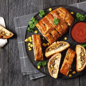 Assemble Braids: Roll out the thawed puff pastry sheet on a lightly floured surface. Cut the pastry into equal-sized rectangles. Spoon the beef mixture onto one half of each pastry rectangle, leaving a border around the edges. Fold the other half of the pastry over the filling to create a braid shape. Press the edges to seal and crimp with a fork.